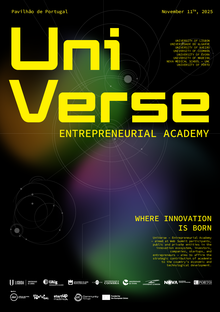 A “UniVerse – Academia Empreendedora” é uma iniciativa colaborativa que reúne as Universidades de Lisboa, Porto, Coimbra, Aveiro, Algarve, Évora, Madeira e NOVA FCT, contando com o apoio da Agência Nacional de Inovação, da Startup Portugal, Startup Madeira e do EIT Community Hub Portugal.